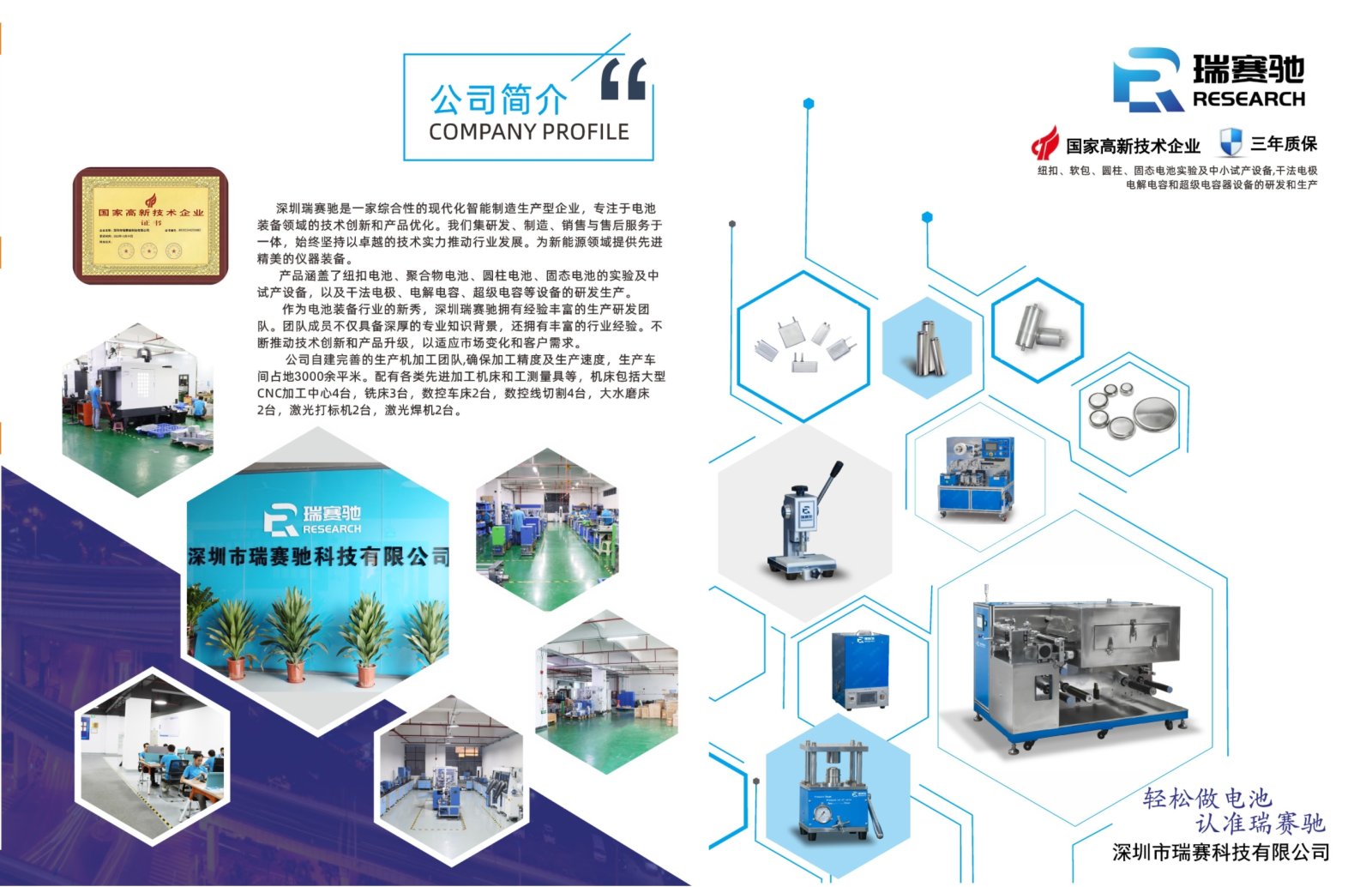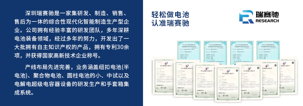 瑞赛驰由英文Research音译而来,公司致力于电池实验装备的开发生产制造,为新能源领域提供先进精美的仪器装备。在电池研发过程中需要测试材料及工艺参数对电池性能的影响,为了测试和验证材料及生产工艺会小批量的制作出成品电池来验证结果。而我司能提供一整套先进的小批制作电池的装备和解决方案。 公司拥有经验丰富的研发团队,多年深耕电池实验装备领域,产线布局完善先进。涵盖纽扣电池(半电池)、聚合物电池、圆柱电池的小试与中试以及电解电容、超级电容器设备的研发生产和手套箱集成系统。